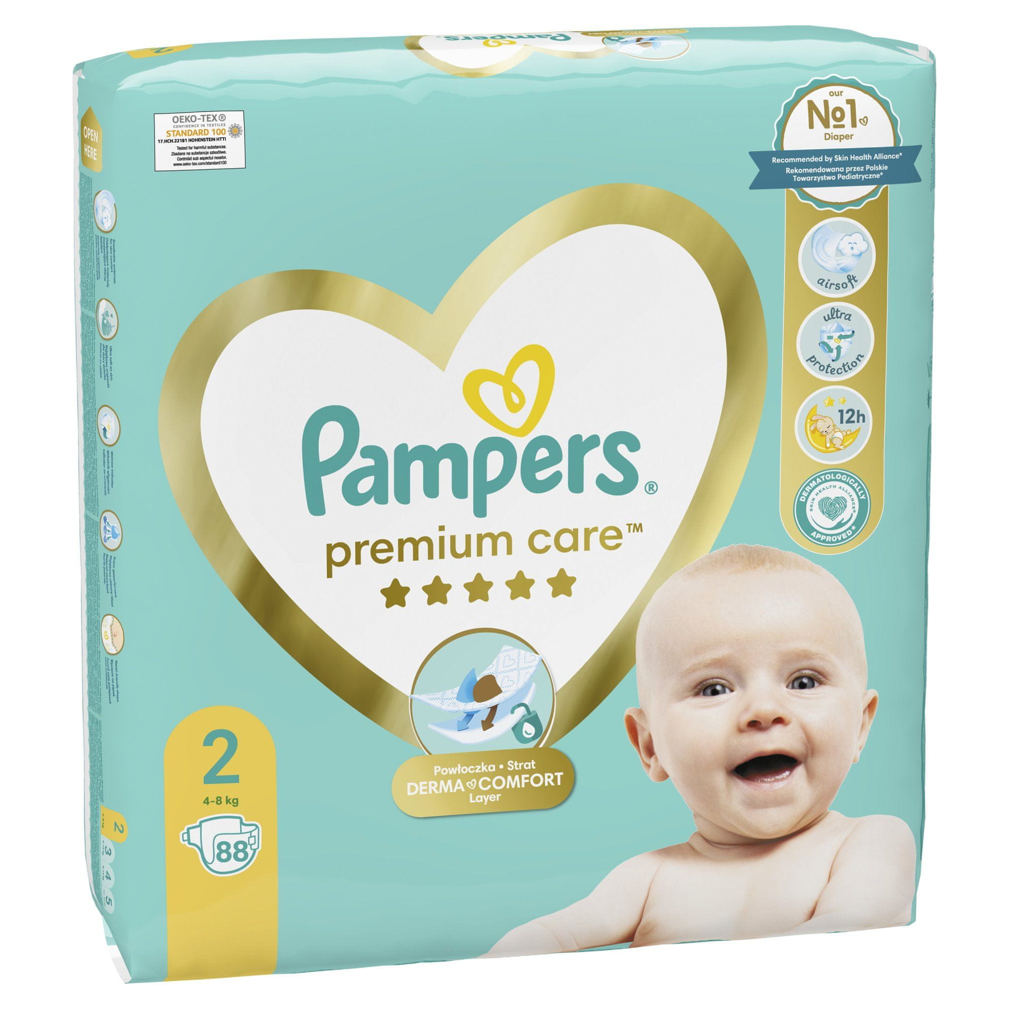 Premium Care plenice preprečujejo dolgotrajni stik kože z urinom in redkim blatom, ki povzroča nemir in vznemirjenost v otroku. Imajo posebno plast Derma Comfort, ki z vpojnimi porami takoj odstranijo vlago in tekočino stran od kože. Poleg tega omogočajo mikropore v plenicah neprekinjen pretok zraka v plenici. S tem ostane dojenčkova koža suha in zaščitena. Edinstveni trojni zaščitni sistem hitro absorbira tekočino in preprečuje iztekanje okoli pasu in nog, za do 12 ur zaščite. Mehki materiali nudijo nežen stik s kožo.
