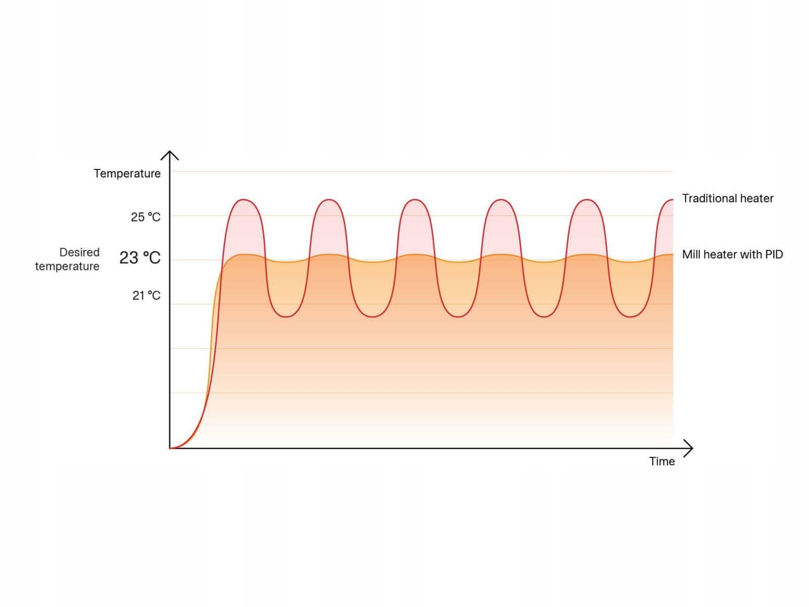 • Prvi panelni radiator s tehnologijo ogrevanja z nadzorom PID. Ko je dosežena želena temperatura, radiator z zmanjšanjem stopnje moči to temperaturo vzdržuje. To pomeni stabilnejše ogrevanje z manjšim nihanjem temperature.