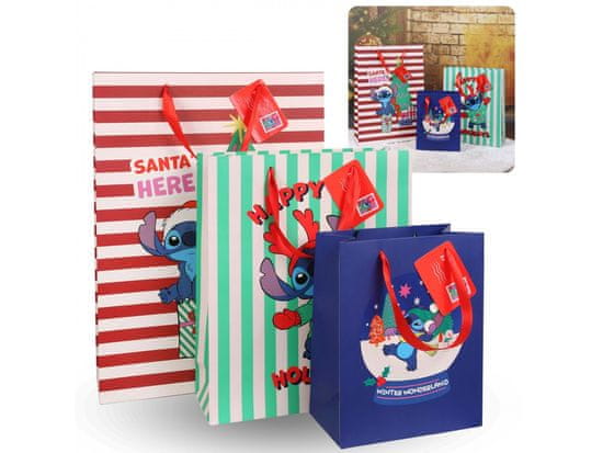 Komplet prazničnih darilnih vrečk, okrašenih z motivom znanega lika Stitch z Božičkovo kapo, ki so idealne za zavijanje daril za božič.