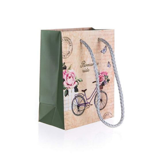 Velikost darilne vrečke z dekoracijo ROMANTIC RIDE. S, izdelan iz papirja in opremljen s tekstilnim ročajem. Dimenzije torbe: 11 × 14 × 6 cm. Izbirate lahko med 4 drugimi velikostmi in 5 dekorji.