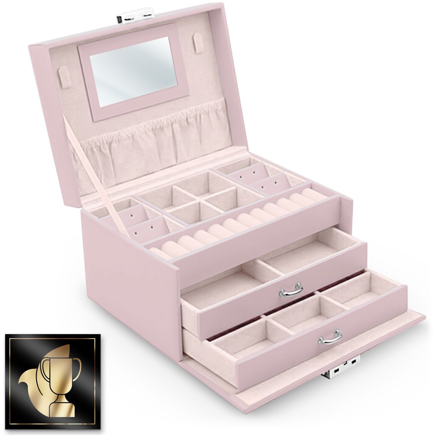 Zaklepanje s ključem (za preprečevanje nenamernega odpiranja) Ogledalo Kavlji za ogrlice Velik žep Praktični predelki Prostor za uhane Prostor za prstane Zelo vzdržljiv material iz PU usnja, odporen proti obrabi Predali s prekati