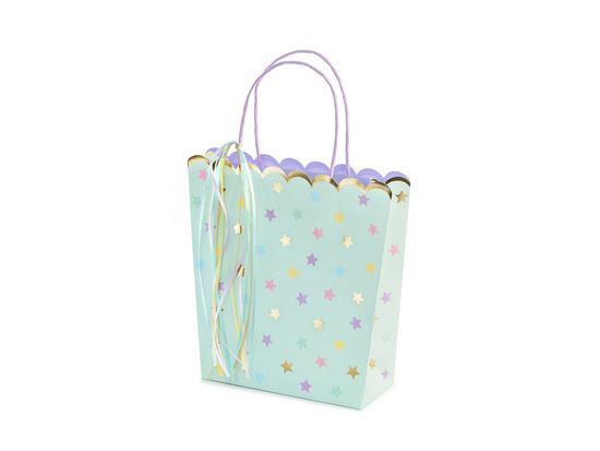 Darilne vrečke barve mete z barvitim in zlatim kovinskim potiskom, barvitimi trakovi in vijoličnim potiskom v notranjosti vrečk, dimenzije brez ročajev približno 22 × 23 × 8 cm.