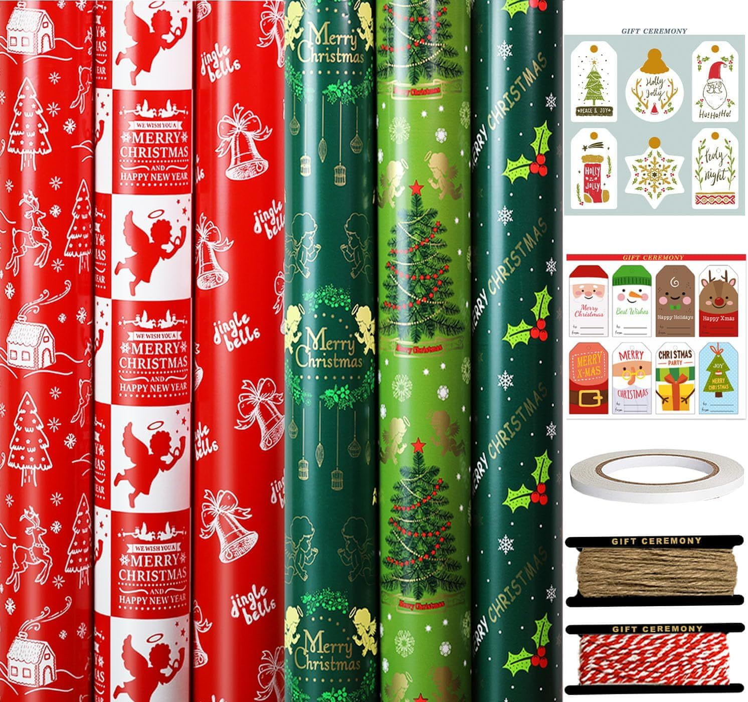 shumee Božični darilni ovojni papir, komplet 6 rolic z vrvico in lepilom, 43 cm x 3 m