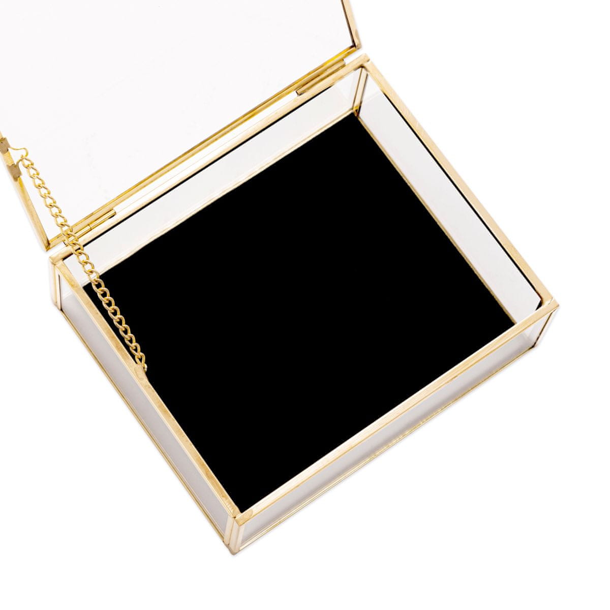 Škatla za nakit HOMLA GRAZIA navdušuje s svojim elegantnim dizajnom. Stene škatle so izdelane iz prozornega stekla, obdane z zlatimi kovinskimi robovi. Dno škatle je obloženo s črnim žametom, kar vam omogoča še bolj učinkovito razstavljanje vašega dragocenega nakita. Postavite jo v spalnico, kopalnico ali dnevno sobo in uživajte v funkcionalnem dodatku, ki bo vaši aranžmaju dodal šik in eleganco.