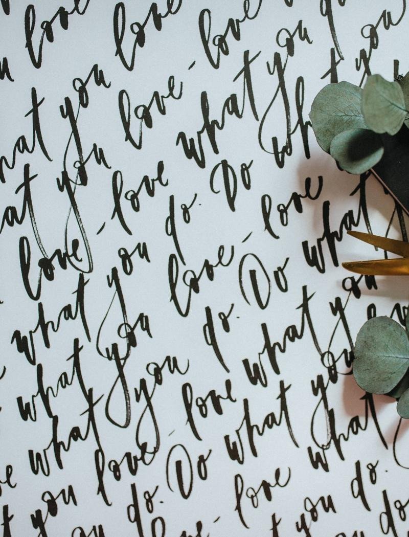 Be Nice EKO pisava za zavijalni papir s citatom „do what you love – love what you do“ na belem papirju. Celoten opis