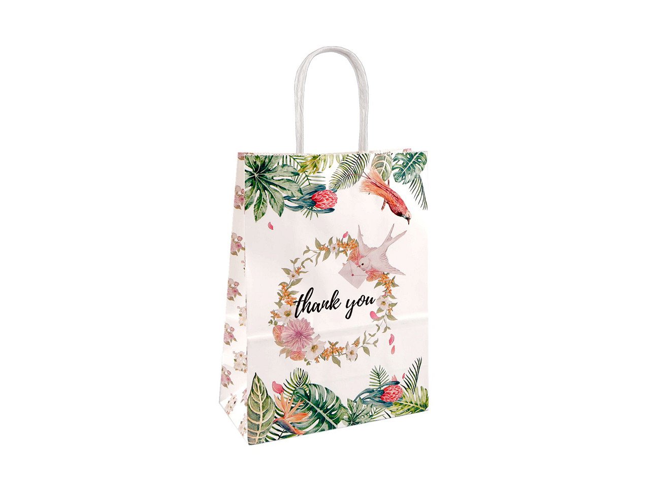 Papirnata darilna vrečka je na obeh straneh okrašena s slikami in napisom „hvala“. Celoten opis