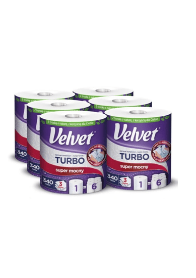 Velvet TURBO Giga Roll – Moč, ki jo občutite! Izjemno zmogljiva kuhinjska brisača za vsak kotiček vašega doma Debele, a mehke 3-slojne plasti belega svilenega papirja odlično vpijajo vlago in omogočajo hitro čiščenje brez packanja. Pakiranje: 6 rol Celoten opis