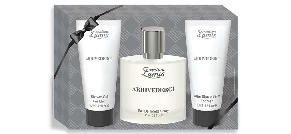Kozmetični set Arrivederci je opisan kot drzna, moška dišava, navdihnjena z morjem, soncem in vetričem sredozemskega otoka. Ta vodna, aromatična dišava se odpira z notami bergamotke, nerolija in zelene mandarine. Ta sestava se odpira z iskrivo mešanico citrusov, kjer se sočna pomaranča sreča z energično limeto in mandarino. Bergamotka in limona dodata lahkotnost ter ustvarita sijoč, svež začetek, neroli in nežen jasmin pa prinašata subtilno cvetlično eleganco. V srcu dišava postane bolj aromatična z rožmarinom, ki ji daje zeleno, rahlo zeliščno ostrino. Kapucinka doda vodno, hladno svežino, jasmin pa v tej fazi postane bolj kremast. Kalon poudarja morske, sveže tone, ki vnašajo pridih čistega zraka. V osnovi sestava postane toplejša in globlja z jantarno mehkobo. Pačuli in hrastov mah dajeta vonju zemeljski, eleganten značaj, cedra pa uvaja suhe, lesne poudarke. Celotno dišavo obdaja beli mošus, ki pušča čisto, čutno in dolgotrajen sled.