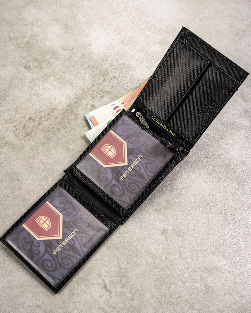 - Najvišja kakovost izdelave | Denarnica je izdelana iz visokokakovostnega naravnega usnja, na zunanji strani prevlečenega s plastjo, ki spominja na ogljikova vlakna (ogljik)
