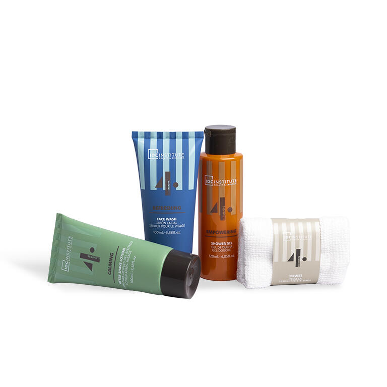 • vsebuje: gel za prhanje 120 ml, gel za umivanje obraza 100 ml, balzam po britju 100 ml, brisačo, kozmetično torbico