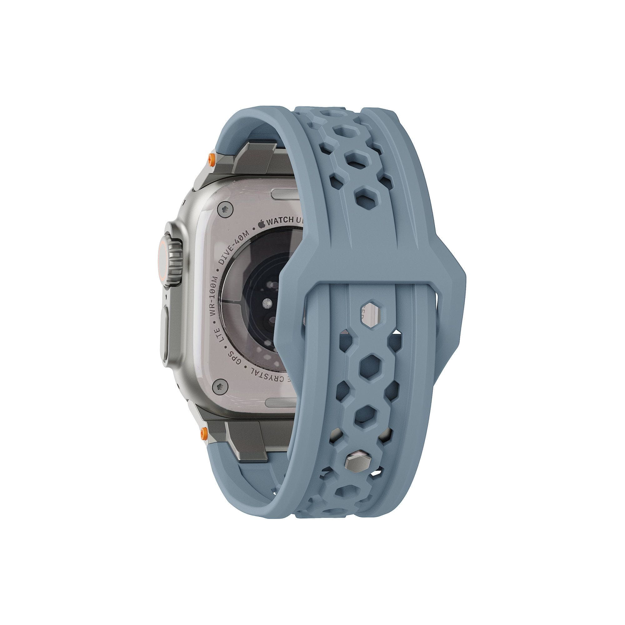 • Podajte se na pot s paščkom Monarch za Apple Watch – popolno mešanico robustne moči in vrhunske izdelave. Zasnovan za tiste, ki zahtevajo vzdržljivost, ne da bi pri tem žrtvovali stil, je ta pašček izdelan tako, da prenese vremenske vplive in hkrati izboljša vaš videz. Pašček Monarch, izdelan iz vrhunskega fluoroelastomera FKM, zagotavlja vrhunsko zmogljivost v vsakem okolju. Pašček je odporen na ekstremne temperature, kemikalije, UV-žarke, vodo in prah, zaradi česar je popoln spremljevalec za pustolovščine na prostem. Posebej izdelana strojna oprema iz nerjavečega jekla v barvi titana doda pridih prefinjenosti in hkrati zagotavlja vzdržljivost, na katero se lahko zanesete. Sistem zapenjanja z čepki ohranja pašček varen in eleganten, preprečuje zatikanje in ohranja odvečni del paščka lepo skrit za celodnevno udobje. Perforirana zasnova izboljša pretok zraka, da vam pomaga ostati hladni, drzne poudarjene barve pa dodajo sodoben pridih. Vzdržljiv. Prefinjen. Monarch.