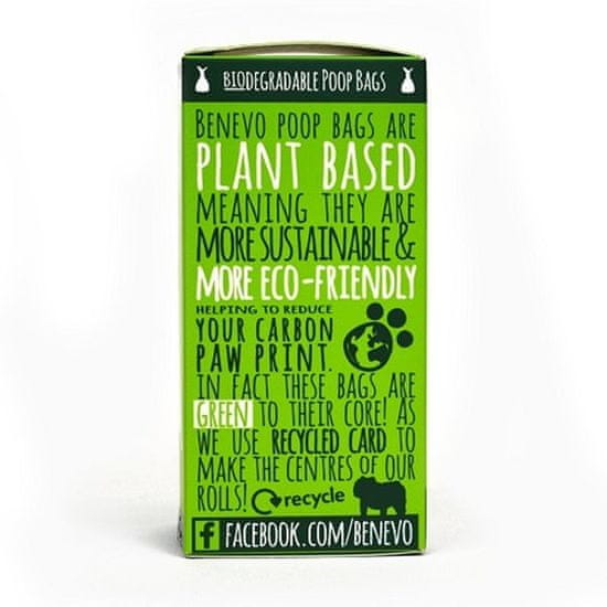 Vrečke za iztrebke Benevo so izdelane iz trajnostnega in ekološkega koruznega škroba. Te vrečke za iztrebke, ki jih je mogoče kompostirati s certifikatom, so dobesedno tako okolju prijazne, kot so le lahko! Za razliko od vrečk, ki se v zemlji samo razgradijo in razpadejo na milijone plastičnih delov, te vrečke omogočajo, da metabolizem mikroorganizmov v zemlji razgradi material, tako da se razgradi v svojem naravnem okolju.