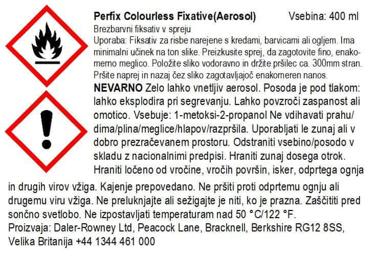 Perfix fiksativ uporabljamo za zaščito risb narisanih s pastelom, ogljem ali voščenkami. Njegov vpliv na barvne tone v risbah je minimalen. OPOZORILO: Pred nakupom izdelka natančno preberite etiketo (slika) in upoštevajte navodilo za uporabo.Vedno upoštevajte informacije na etiketi izdelka. Celoten opis