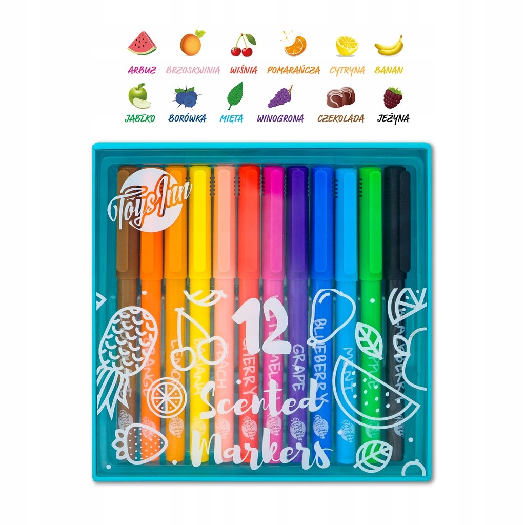 Barve (in vonji) flomastrov: barva kože (breskev), rumena (banana), temno rumena (limona), oranžna (oranžna), rdeča (češnja), fuksija (lubenica), vijolična (grozdje), temno modra (borovnica), svetlo modra (meta), zelena (jabolko), rjava (čokolada), črna (robida).