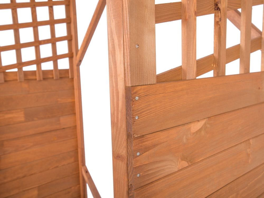 Drvarnica 168 × 130 cm iz podjetja Rojaplast. Mere so 170 × 80 × 9 cm. Izdelava iz borovega lesa. Robustna konstrukcija z impregnacijo medene barve. S certifikatom FSC, ki zagotavlja, da les izvira iz trajnostno upravljanih gozdov. Teža znaša 45 kg.