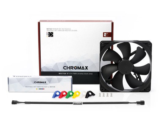 Ventilator NF-A14 je eden izmed najbolj priljubljenih 140 mm ventilatorjev. Zaradi kvadratne oblike je idealen za uporabo na radiatorjih za vodno hlajenje in v omarah. chromax.black.swap izdaja združuje tiho delovanje NF-A14 z odlično zmogljivostjo hlajenja in privlačno povsem črno obliko z zamenljivimi barvnimi protivibracijskimi blazinicami. Blazinice so na voljo v rdeči, beli, modri, zeleni, rumeni in črni barvi in omogočajo, da barvno uskladite zasnovo ventilatorja s preostalim ohišjem. Za dodatno prilagajanje zasnove Noctua ponuja dodatne barvne dodatke, kot so notranji kabli, protivibracijske blazinice, protivibracijski nosilci itd., ki jih lahko kupite ločeno.