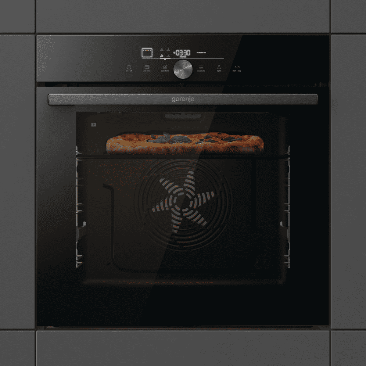 Gorenje GO66E Pizza350C pečica v črni barvi se ponaša s prostornino 77 l ter 23 programi pečenja. Umeščena je v energijski razred A+, na cikel pa porabi od 0,71 do 1,03 kWh energije. Celoten opis