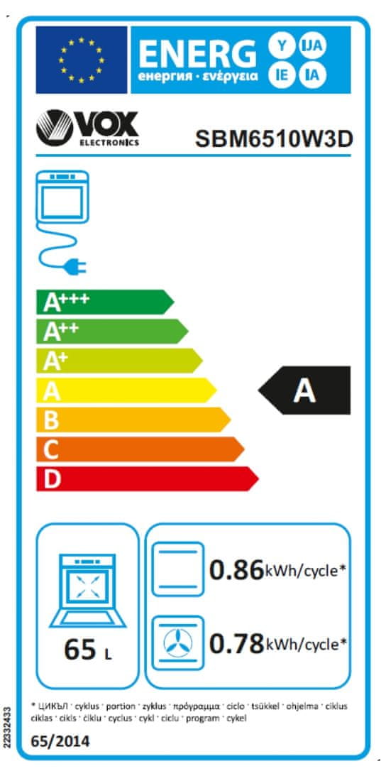Vox Electronics vgradna pečica SBM6510W3D vgradna pečica z 65 litri prostornine prinaša dovolj prostora za pripravo večje količine hrane. Opremljena je z zgornjim in spodnjim grelcem ter ima funkcijo žara z močjo 1400 W. Upravlja se s pomočjo gumbov na sprednji plošči. Ima mehanski časovnik in termostat. V notranjosti najdete 2 pladnja (1 plitki in 1 globok) ter mrežno rešetko. Za boljšo preglednost je notranjost pečice osvetljena.