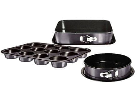 • komplet pekačev za pečico s titanovo prevleko – skupno 3 kosi različnih pekačev, vključno z odstranljivimi pladnji – pekač za mafine 12 mafinov 35 × 26,5 × 3 cm – okrogel pekač za torto 26 × 7 cm.