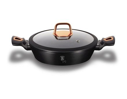 • material: kovani aluminij s površino iz marmorja – premer: 28 cm – višina: 7,5 cm – prostornina: 3,8 l – barva: črna/rožnata – toplotno odporen pokrov s silikonskim obodom – 3-slojna.