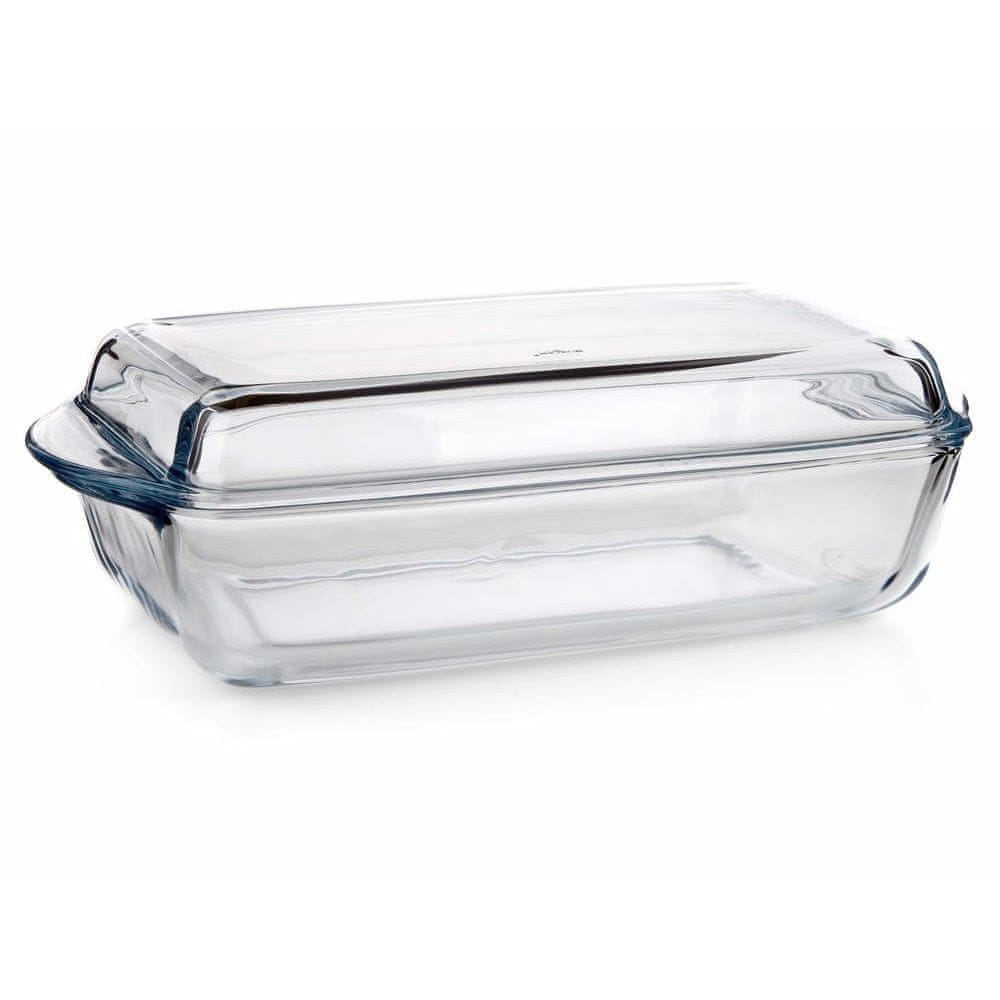 Kvadratna posoda za peko s pokrovom 4,12 l iz kuhinjskega stekla, dolžina 33,8 cm, širina 19,1 cm, višina 8,8 cm. Posoda za peko je izdelana iz trdega borosilikatnega stekla, ki je zelo trpežno, tako mehansko kot temperaturno (temperaturno območje od –50 do / 500 stopinj). C). Prednost je dolga življenjska doba, higienska varnost (steklo je gladko in neporozno), enostavno vzdrževanje (lahko se pomiva v pomivalnih strojih), steklo je ekološki material.