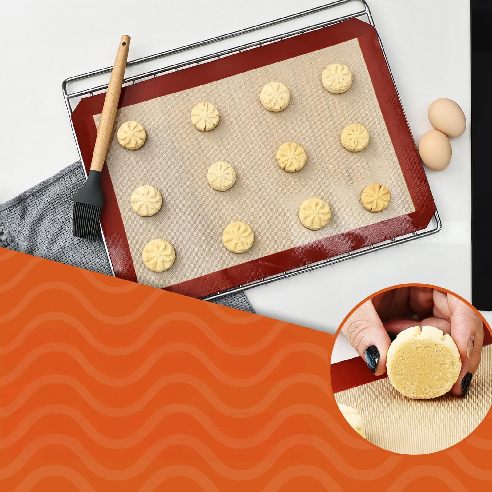 Komplet 3 silikonskih podlog za peko je praktična in ekološka rešitev za vsakega ljubitelja domačih pekovskih izdelkov. Komplet vključuje dve podlogi dimenzij 29,5 × 42 cm in eno manjšo 29 × 21 cm, kar omogoča prilagajanje različnim velikostim pekačev in kuhinjskim potrebam. Izdelane iz visokokakovostnega živilskega silikona, brez BPA, so podloge odporne na visoke temperature in namenjene večkratni uporabi. Zahvaljujoč neprijemljivi površini ne zahtevajo uporabe olja ali peki papirja, kar pomeni bolj zdravo in ekonomično pripravo jedi.