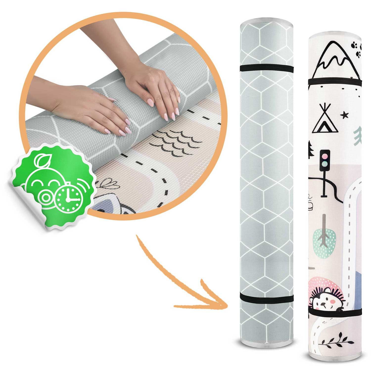 Penasta preproga Nukido Ta edinstvena, velika, zvita podloga, dimenzij 180 × 150 cm, ima veliko praktičnih uporab. Vašemu otroku bo zagotovil udobje med igro in učenjem plazenja!