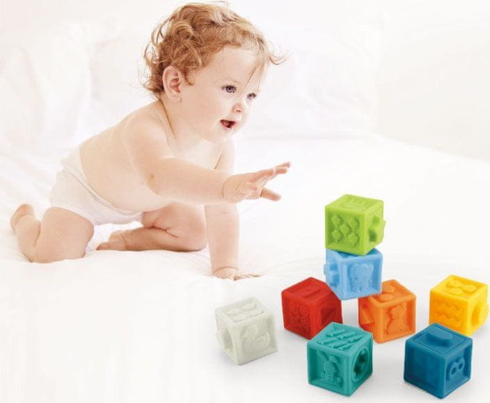 Razvijajo motorične sposobnosti in čutno zaznavanje, vsaka stran ima drugačno teksturirano površino, obliko, žival, številko in set, ki ustreza številki, ob stiskanju piskajo, lahko jih zlagamo tako, da štrlečo obliko vstavimo v isto luknjo kocke, primerne so za spodbujanje gibanja, razvijajo domišljijo in spretnost, prvo prepoznavanje barv, slik in številk.
