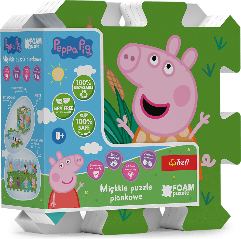 Trefl PUZZLE iz pene – Peppa Pig. Licenčna sestavljanka iz pene. Vsebujejo 8 velikih delov, so mehke, pisane, enostavne za pranje in jih lahko uporabite za sestavljanje 3D-oblik, kot sta kocka ali škatla. Uporabljajo se lahko tudi kot igralna podloga. Sestavljanke iz pene razvijajo otroško domišljijo ter pomagajo otrokom pri učenju barv in oblik. Narejene so iz nestrupenega materiala, ki ne vsebuje BPA. Primerne so za otroke od 2. leta starosti dalje.