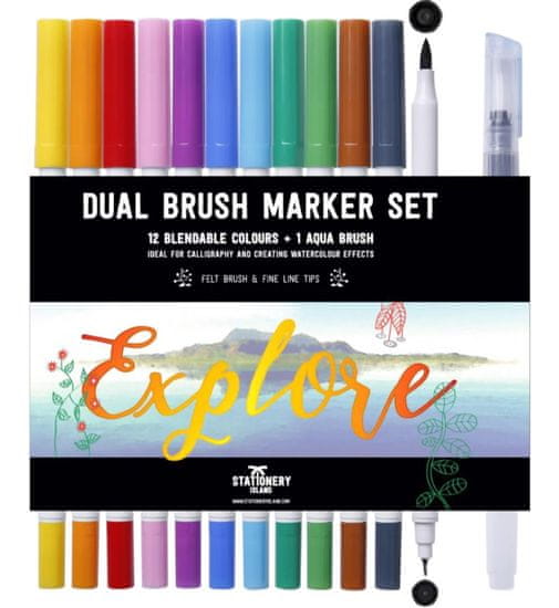 Komplet 12 akvarelnih flomastrov z dvojno konico. Komplet 12 akvarelnih flomastrov z dvojno konico Stationery Island + 1 čopič Aqua. NAJBOLJŠI KOMPLET FLAMENTOV – Ti inovativni flomastri z dvojno konico imajo na enem koncu srednje prožne filcane konice, na drugem pa tanke črtala, kar zagotavlja vrhunski nadzor nad potezami. BREZPLAČEN ČOPIČ AQUA – Ta paket, prijazen za potovanja, vključuje brezplačen polnilni vodni čopič, s katerim lahko ustvarjate mešane akvarelne mojstrovine. ČRNILO ZA AKVARELOV – Črnilo za akvarelne flomastre se resnično meša in vam omogoča ustvarjanje edinstvene palete barv kar na strani. Neskončne barve pomenijo neskončne možnosti. DVOJNI FILSTENI IN VODILA IZ VLAKEN – Srednje mehki in krepki filcani konici omogočajo odlično variacijo črt, idealno za kaligrafijo in senčenje, medtem ko je tanka črtala idealna za oris in fine podrobnosti. Komplet 12 akvarelnih flomastrov z dvojno konico Stationery Island + 1 čopič Aqua
