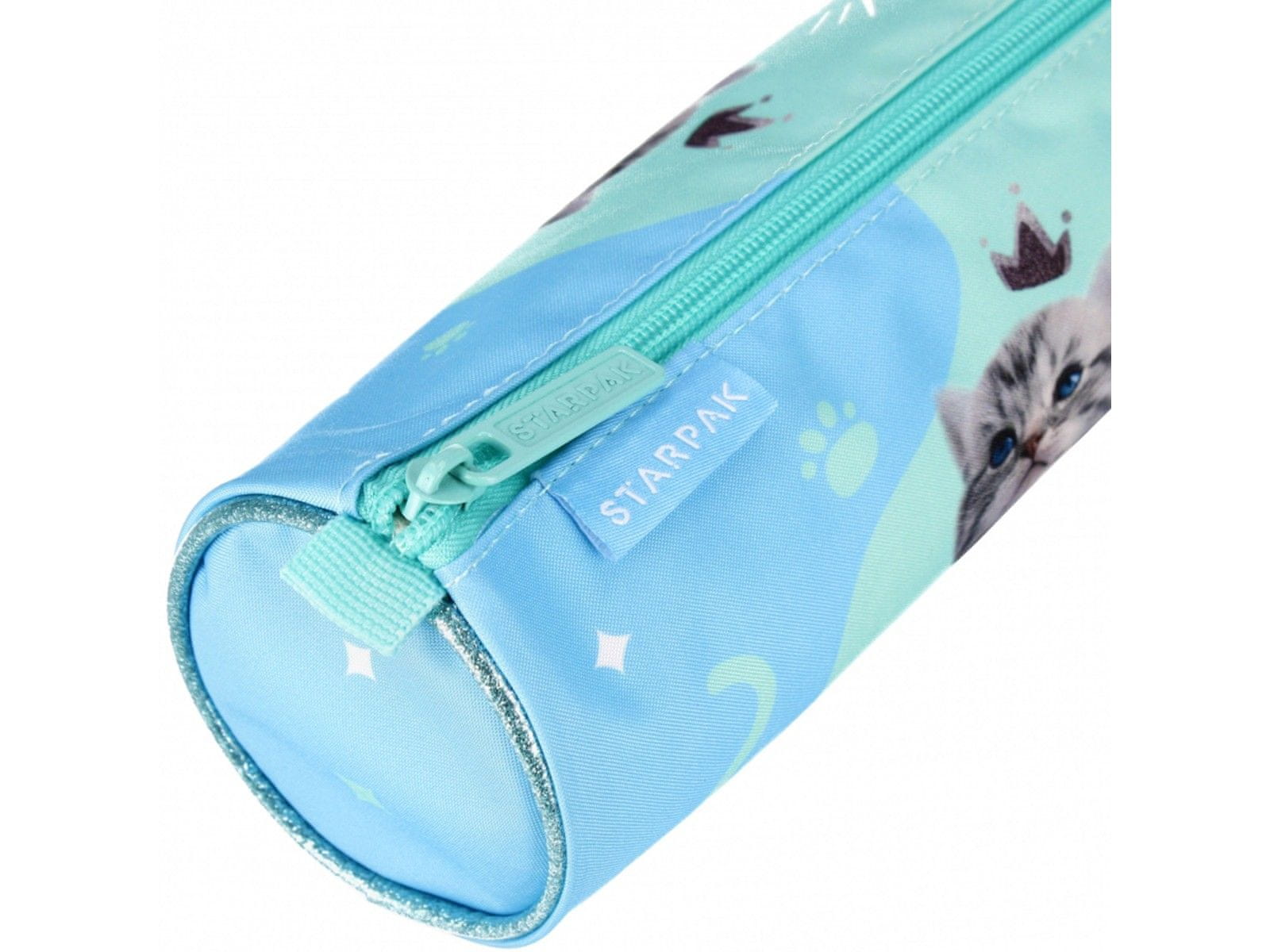 Ta čudovita modra peresnica v obliki cevi, z dimenzijami 22×8×8 cm, je idealna za vsako mlado ljubiteljico mačk. Peresnica je okrašena s slikami prikupnih muck ter dodatnimi grafičnimi elementi, kot so krone in napisi, kar jo naredi ne le praktično, ampak tudi vizualno zelo privlačno. Izdelana je iz Celoten opis