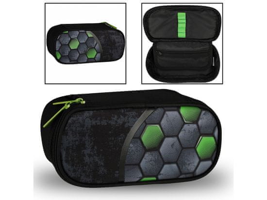 Ta vzdržljiva in stilska peresnica v športnem slogu je idealna izbira za vsakega mladega ljubitelja nogometa. Odlikuje jo edinstven vzorec, ki spominja na nogometno igrišče in panele nogometne žoge, medtem ko ji živo zeleni poudarki dodajajo energijo. Peresnica je opremljena z močnim zelenim zadrgo, Celoten opis