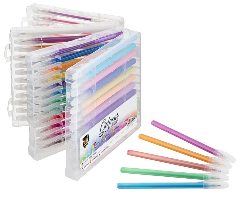 Velik komplet gelskih pisal vsebuje: 12 neonskih barv 12 bleščečih barv 12 kovinskih barv 12 pastelnih barv Celoten opis