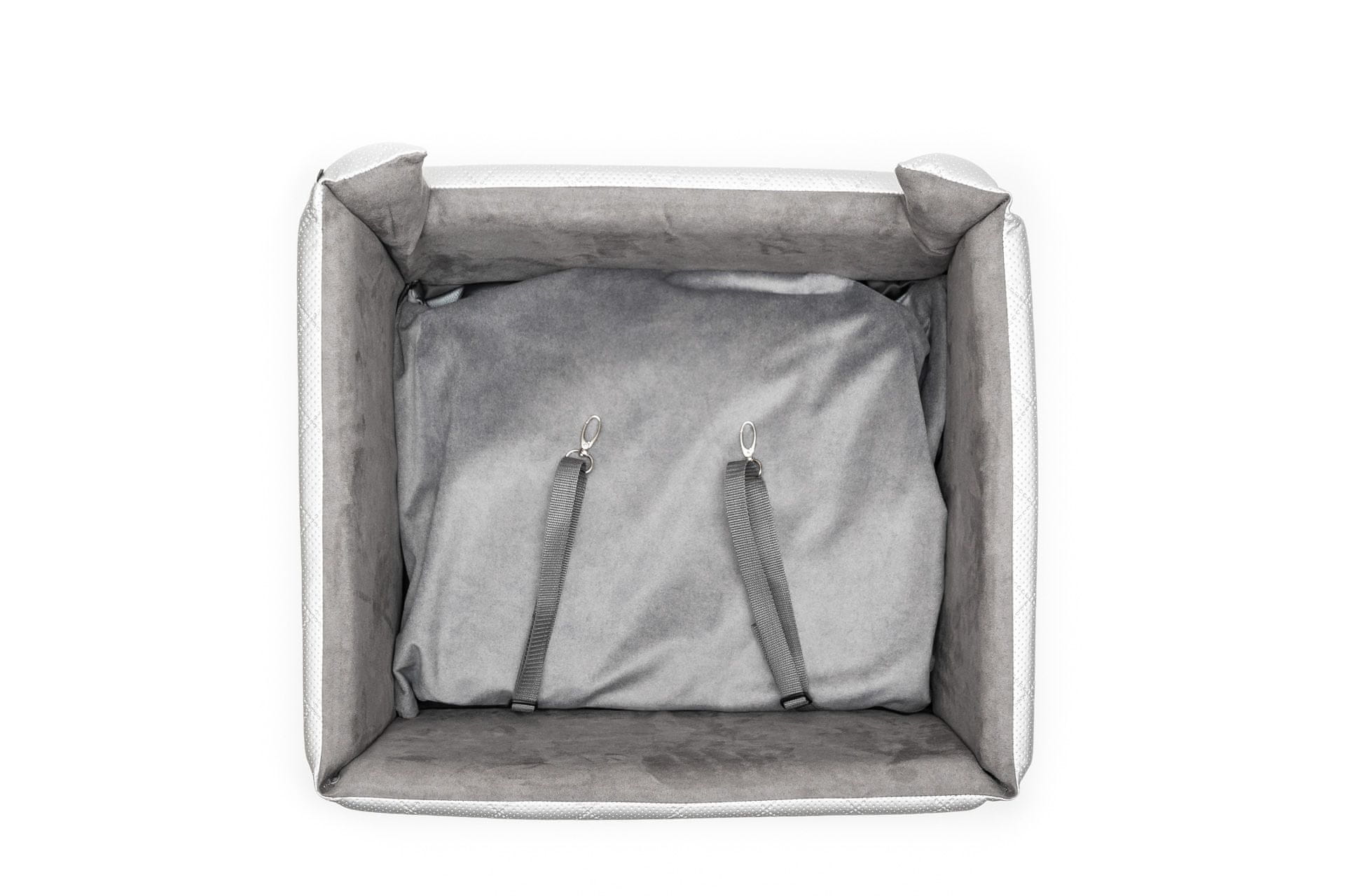 Notranjost – 52 cm x 45 cm x 20 cm zunanja stran – 57 cm x 50 cm x 25 cmPasji avtosedež Pasji avtosedež Mia v čudoviti srebrni barvi bo poskrbel, da se bo vaš ljubljenček počutil udobno, stabilno in zato varno!
