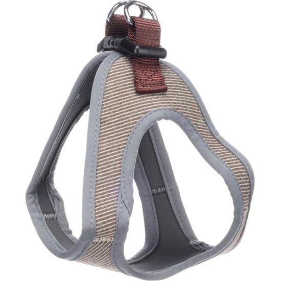 Prsni pas iz trpežnega najlona je opremljen s plastično zaponko za zapenjanje in dvema kromiranima D-obročema za pritrditev povodca. Robovi postroja so obrobljeni s trdnim robom za dodatno udobje psa. Velikost: S Mere (približno): A = 35 cm, B = 40 cm (glej sliko) Material: Material: najlon Barva: Barva: svetlo rjava