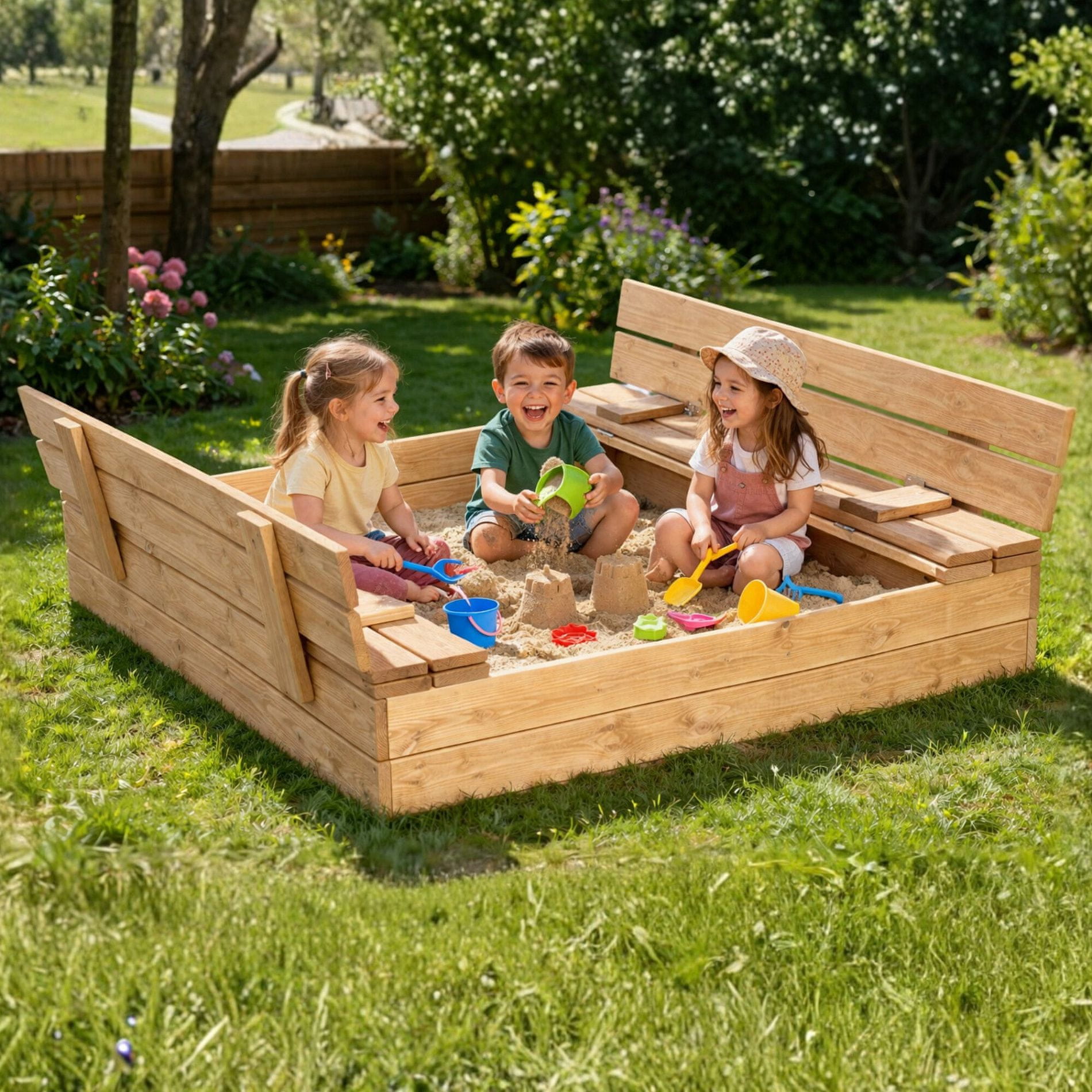 To kakovostno vrtno peskovnik je izdelano iz trpežnega smrekovega lesa debeline 20 mm, kar zagotavlja trdnost in dolgo življenjsko dobo. Naravna izvedba brez površinske impregnacije omogoča individualno prilagoditev po vaših željah, lahko ga pobarvate ali obdelate v skladu s stilom vašega vrta.