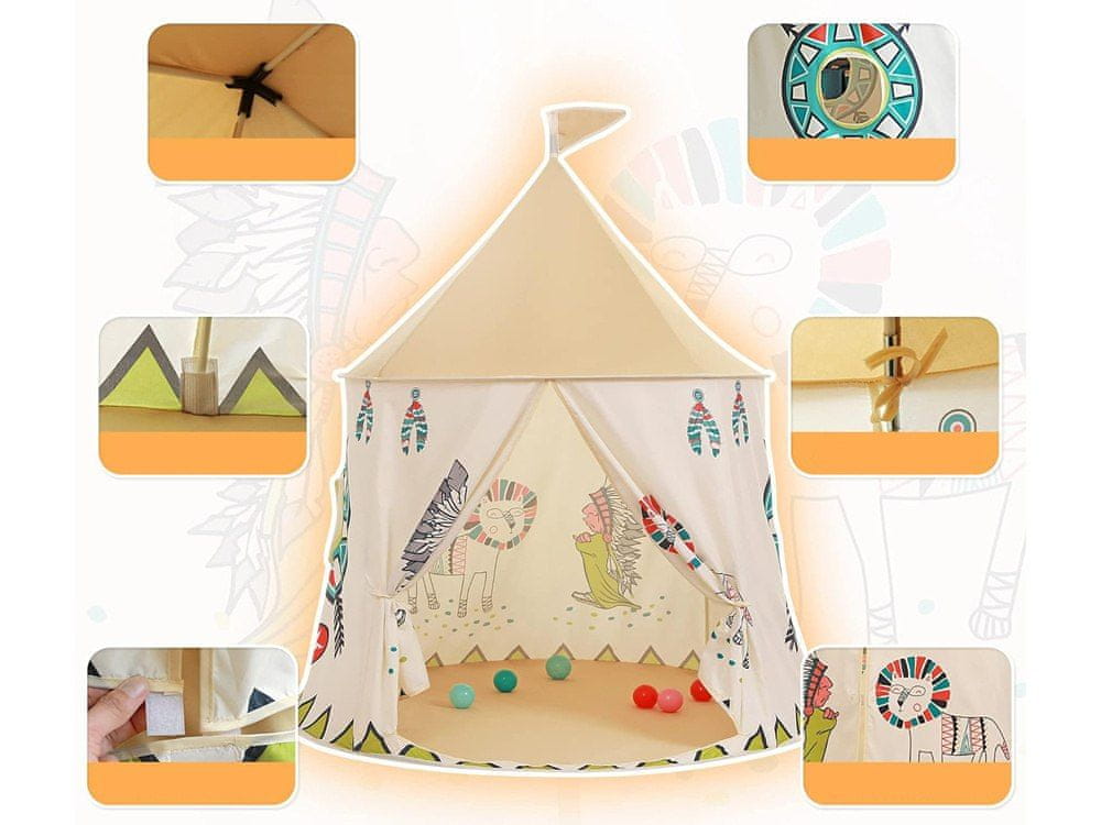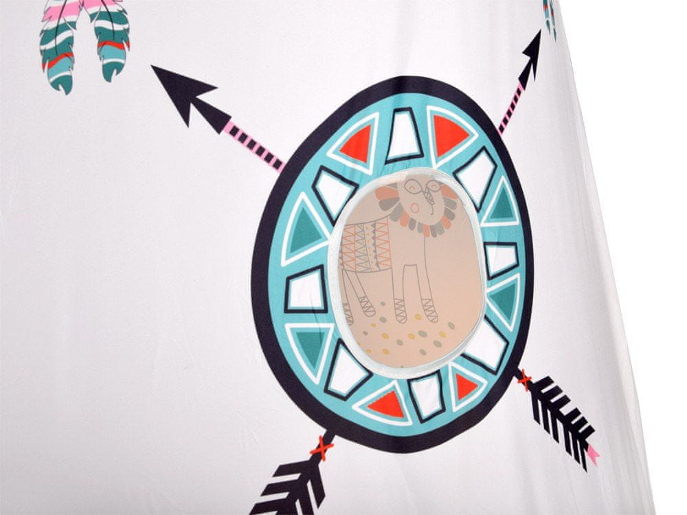 Šotor je izdelan iz enostavnega za čiščenje, zračnega materiala z grafiko, ki spominja na ameriške indijanske tipije.