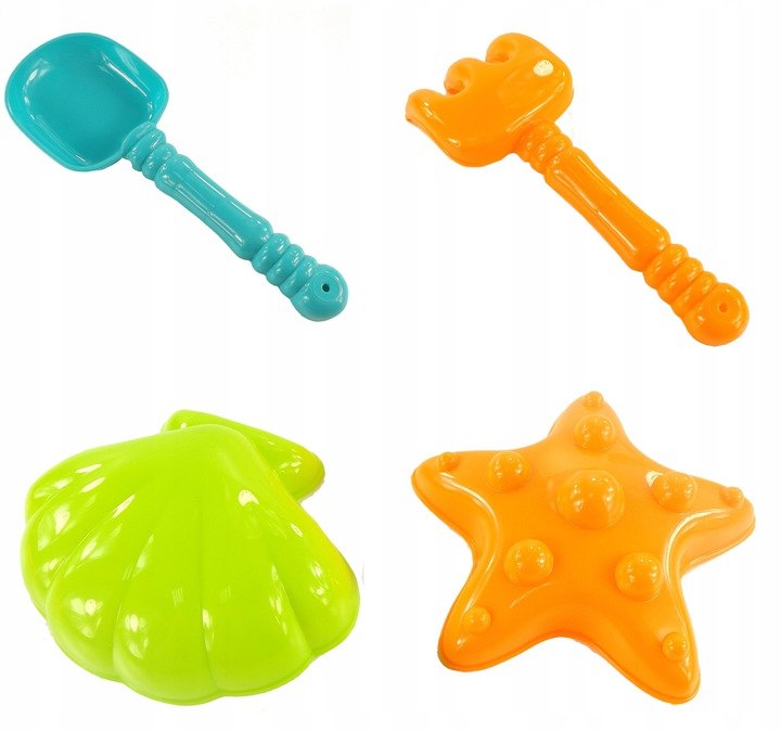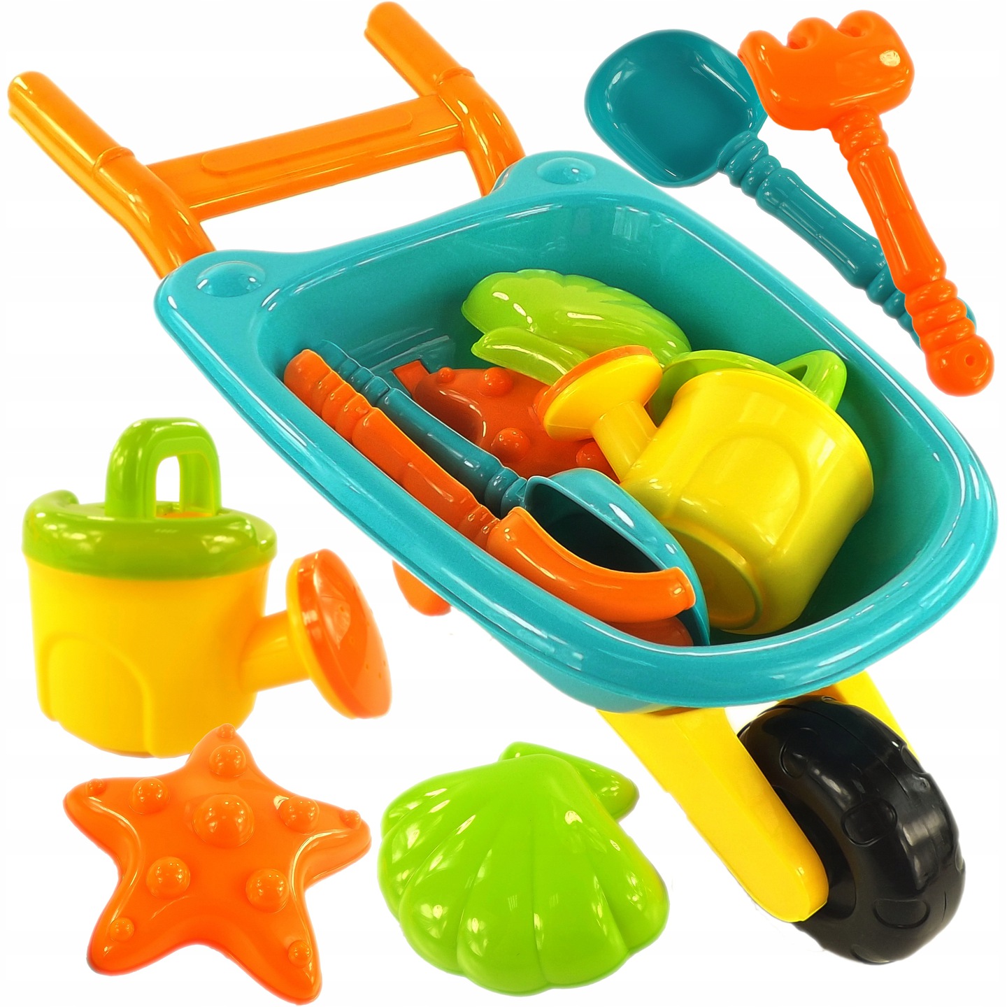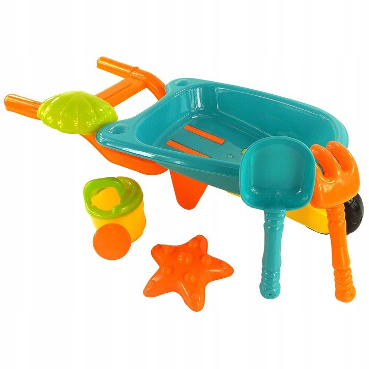 Popoln komplet za ustvarjalno igro – samokolnica, grablje, lopata, zalivalka in modelčki (školjka in morska zvezda) spodbujajo gradnjo peščenih gradov in ustvarjanje majhnih vrtnarskih projektov.