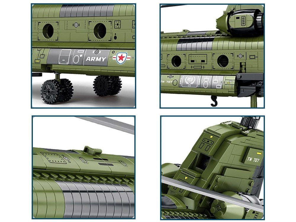 Sestavljanje tega modela je pravi užitek za navdušence nad vojsko, modelarstva in tehnologijo. Vsak element je bil skrbno zasnovan, da ustvari robustno in realistično strukturo, ki zvesto ujame videz legendarnega helikopterja CH-47 Chinook. To je več kot le komplet kock – to je edinstvena izkušnja sestavljanja, ki zagotavlja tako zadovoljstvo kot osupljiv model za vašo zbirko.