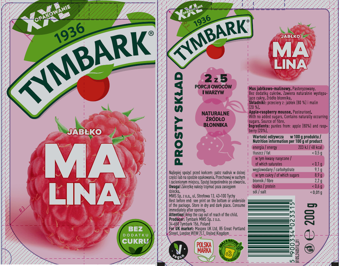 Sestavine Pireji iz: jabolk (80 %) in malin (20 %).