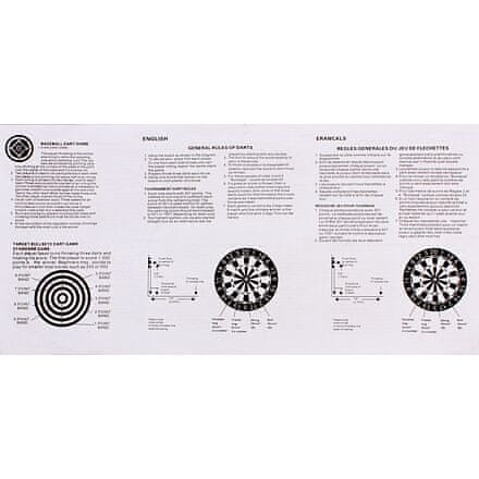 Dvostranska tarča za pikado DB 40 je idealna tarča za začetnike in rekreativne igralce. Tarča je izdelana iz večplastnega stiskanega papirja s tiskano kovinsko konstrukcijo. Dimenzije tarče so 40 × 1 cm. Na eni strani je prikazana klasična tarča s stranskimi številkami in jeklenimi žicami. Druga stran ponuja poenostavljeno črno-belo različico s točkami od 1 do 9. Paket vsebuje tudi 6 kosov plastičnih puščic z jeklenimi konicami. Parametri.
