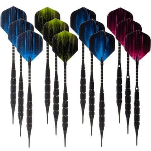 • VELIK SET – to je popoln komplet za igranje pikada. Komplet je opremljen z 12 puščicami, 100 mehkimi konicami, 2 ščitnikoma za letenje, 20 O-obročki in 1 večnamenskim orodjem.