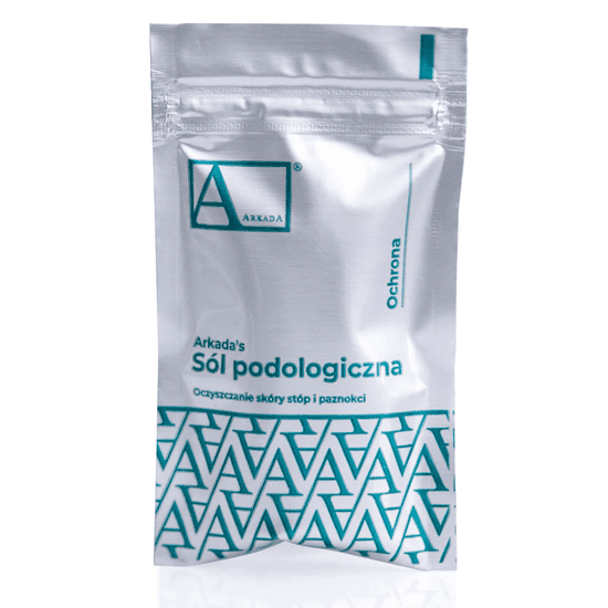 Arkada Podiatry Salt Sample Pri ustvarjanju formule so ustvarjalci želeli združiti kozmetično in razkužilo za nogavice in obutev. V prvi fazi projekta naj bi izdelali dve ločeni pripravi. Rezultat intenzivnega dela je univerzalni pripravek, ki združuje obe lastnosti. Uporaba: Intenzivno obnavlja in čisti, mehča in lušči povrhnjico, blaži vnetja nohtov in kože stopal, preprečuje širjenje okužbe, odpravlja srbečico, blaži razdraženost, nevtralizira neprijetne vonjave, z dodajanjem perilu razkužuje oblačila in obutev. Izdelek je idealen za: suho, poškodovano, razpokano in dehidrirano kožo ter za različna kožna stanja. Navodila za uporabo: Topli vodi dodajte 2–3 merice soli. Temeljito premešajte, da ustvarite aktivno čistilno peno. Stopala namakajte 5–8 minut. Izpiranje ni potrebno. Stopala osušite in nanesite priporočene negovalne izdelke. Pred namakanjem nogavic in obutve je treba izvesti standardno pranje. Namakajte 5–8 minut, nato sperite s čisto vodo in posušite. Sestavine: Sol – kožo čisti, mehča in lušči. Magnezijev sulfat – ima protivnetne, antibakterijske, antiseboroične in antiperspirantne lastnosti. Limonino olje – uničuje (nevtralizira) mikroorganizme na koži in nohtih. Dezinficira in osveži. Olje poprove mete – podpira regeneracijo poškodovane kože, ima prijeten vonj in daje občutek svežine. Origanovo olje – uniči (nevtralizira) spore družine kvasovk Candida albicans, ki povzročajo ponavljajoče se glivične okužbe kože in nohtov. Deluje protivnetno in antibakterijsko, podpira pa tudi zdravljenje luskavice in ekcema. Olje čajevca – ima protivnetne in protivirusne lastnosti. Z lahkoto prodre v kožo. Zaradi dokazanih protiglivičnih lastnosti se uporablja pri zdravljenju globokih glivic na nohtih in vseh drugih glivičnih okužb kože.