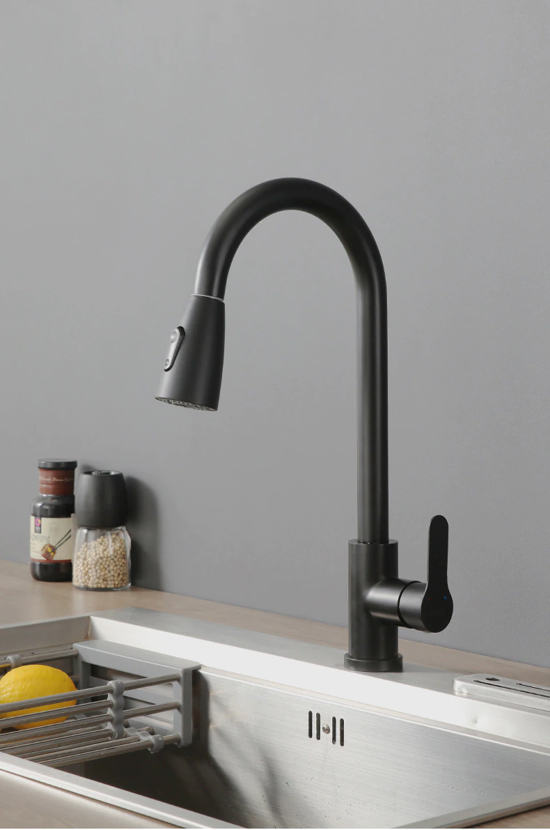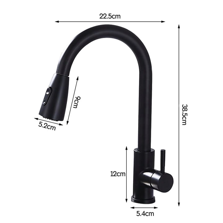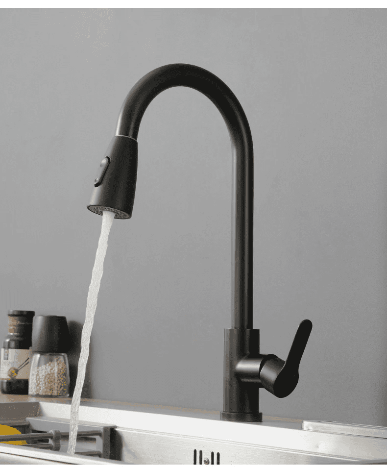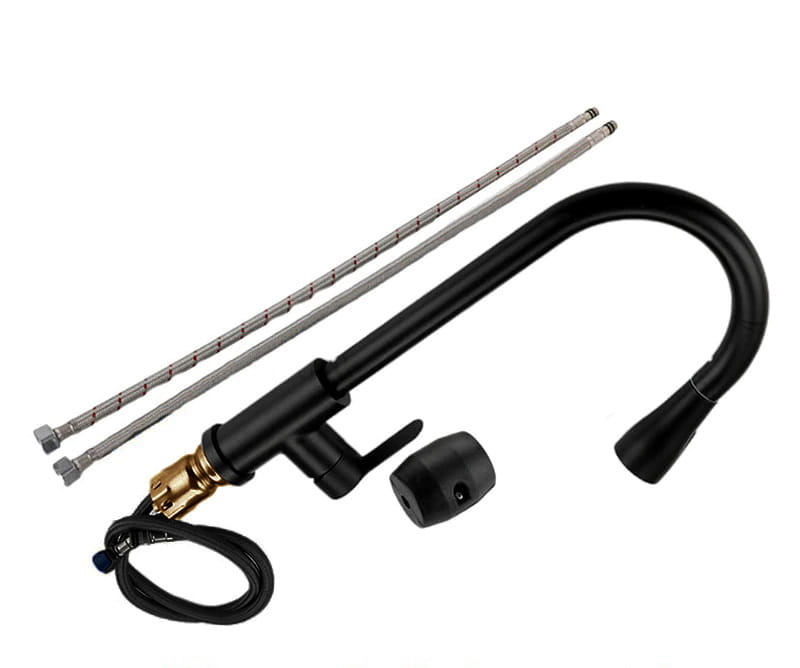 Kuhinjska pipa, mat črna, izvlečni izliv, kuhinjsko korito Celoten opis