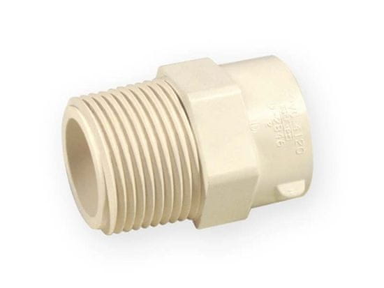 Material CPVC – klorirani polivinilklorid DIMENZIJE od 1/2" do 2" (palcev) izdelano v dimenzijskem sistemu bakrenih cevi CTS od 2" do 4" (palcev) – izdelano v dimenzijskem sistemu jeklenih cevi IPS UPORABA Inštalacije za toplo in hladno vodo, klimatske naprave, industrijske inštalacije za različne vrste kemičnih spojin Tehnični opis: Delovni tlak [MPa] pri + 23°C: 2,76 do 2", 2,9 za 2 1/2" 2,55 za 3", 2,21 za 4" Cevi in fitingi v sistemu PVC-C se povezujejo z agresivnimi lepili. Čas izdelave takšne povezave je odvisen od temperature vgradnje in ne presega 1 minute. Poleg tega so na voljo navojni in prirobnični elementi, ki omogočajo priključitev na kateri koli instalacijski sistem. Navojni: da Področje uporabe: Tlačna inštalacija za pitno vodo Zmanjšanje dimenzije: ne Vrsta navoja: Zunanji Vrsta priključka: Lepljen Velikost zunanjega navoja: 1" Zunanji premer: 28,6 mm Vrsta priključka: Raven konektor