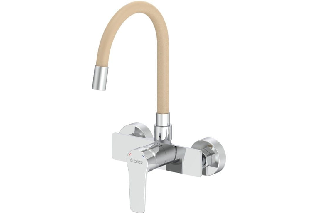 ARMATURA ZA POMIVALNO KORITO S FLEX IZLIVNO CEVJO V BEŽ BARVI ZA ZIDNO MONTAŽO. Celoten opis