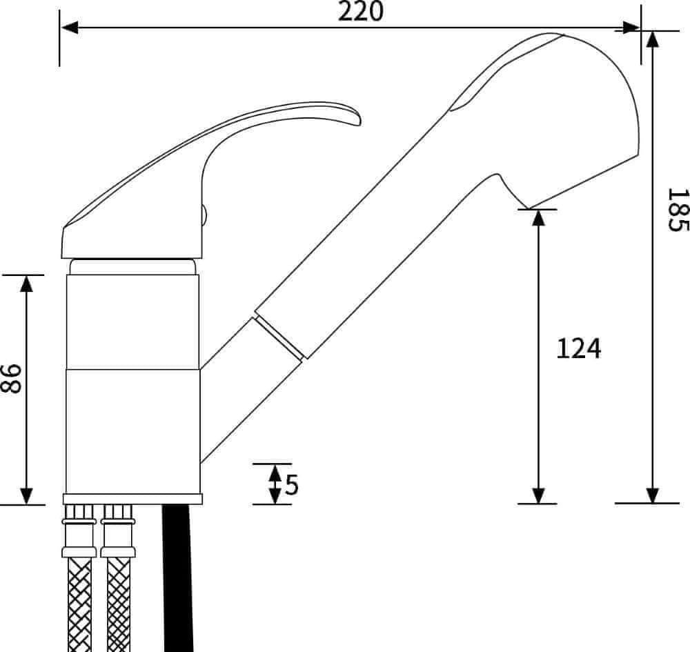 Dimenzije mešalnika so zasnovane tako, da se prilega v različne kuhinjske postavitve. S svojo višino 185 mm in globino 220 mm ne zavzema preveč prostora, hkrati pa ponuja dovolj udobja pri uporabi. Dolžina cevi znaša 1,5 m, kar omogoča večjo fleksibilnost pri rokovanju.