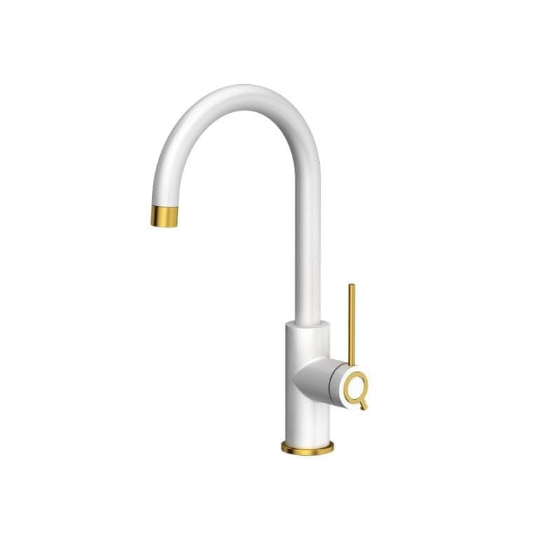 QUADRON Kuhinjska armatura QUADRON JODIE - bela, 360° rotacija, PVD zlitina, visoka kakovost, stenski tip, elegantna zlata zaključna obdelava.