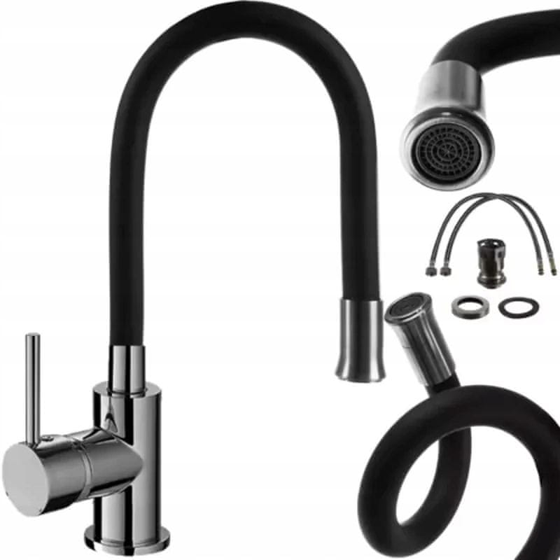 • SPECIFIKACIJA –  barva: črna/srebrna; material: silikon, keramika, satinirano nerjaveče jeklo; vrtljiv izliv: 360°; nastavljiva višina: da; odvit perlator: da; keramični vložek: da; cev: ½ palca; mere: 8×56 cm; teža: 1,175 kg; teža v paketu: 1,552 kg.