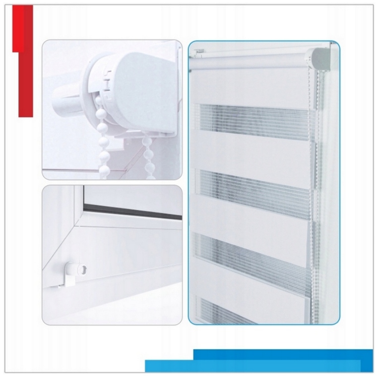 •  – izmenično tkana tkanina (77 mm) in prozorna mreža (50 mm). Komplet vključuje: Rolo zavesa DAN-NOČ